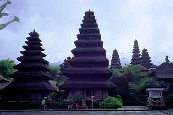 Besakih - a "mother" and the biggest of all Balinese temples. It is beautifully located on the terraces of the southern slopes of Gunung Agung (3142 m) - the highest mountain on Bali. Besakih is actually a complex of about 30 smaller temples and the most important of them is called Puna Penastaran Agung and is dedicated to the holy trinity of Hinduism: Brahma, Vishnu and Siva. Fifty-two steep stairs lead to the sanctuary and along both sides of them sculptures symbolising good and bad spirits have been placed. The gate at the top of the stairs puts an end to the hike for non-believers and we also have to stop here. The remaining part of the temple we can only admire through numerous gates or by looking above the wall. The interior of the temple looks quite empty although there are many meru inside - apparently the largest selection on the whole island. The beginnings of Besakih apparently go back to the 11th century and because it is built of wood, all subsequent generations have rebuilt it again and again. Gunung Batur erupted in March 1963 and destroyed the temple and 1/5th of the island, buried 11,000 people and another 85,000 were left without a roof over their heads. This tragedy echoed all over the world. |