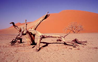 The famous dunes of Sossusvlei are located near Sesriem Canyon. In order to get there, we had to negotiate 500 kilometers of gravel, desert roads. There are not many visitors here. Due to the remoteness and problems with accommodation the place is rarely visited. Half an hour later we reached the dry, flat depression, called Sossusvlei, surrounded by gigantic sand dunes. We were in the heart of Namib Desert. The contrast between the yellow bottom of the depression and the red dunes of different shapes made excellent conditions for photography. The setting sun created a charming symphony of colours, lights and shades. We were really stunned by the spectacle arranged by nature... |