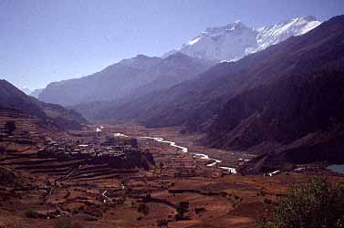 The night before the decisive attempt of Throng La pass was spent in a small lodge called Throng Phedi (4450 m), which really had a high-mountain atmosphere. When we left the warm dining room in the morning it was still dark outside. We could only see the small lights of torches slowly moving up a steep slope opposite the lodge. Two hours later, we warmed our bodies up in the first beams of the rising sun. Past a small pass, the path got less steep but the altitude affected our pace. |